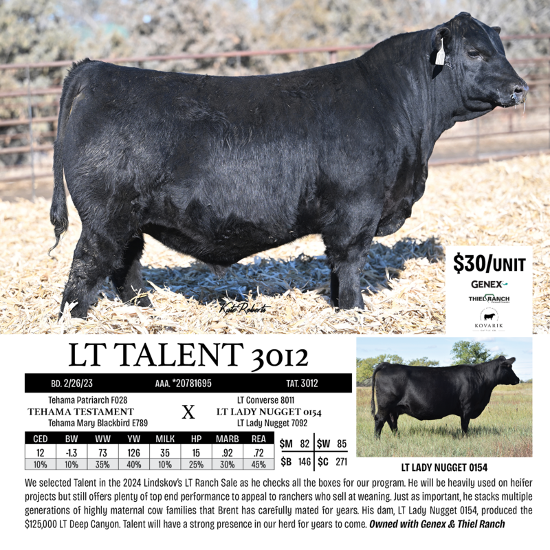 We are proud to be the home of the 2024 high selling ($150,000) LT Talent. Talent combines a masculine, striking profile with natural thickness and an impressive EPD profile. His dam, LT Lady Nugget 0154, also produced the $125,000 LT Deep Canyon that sold in the 2023 sale. She has nursing ratios that read WW 2/102, YW 2/106, IMF 2/103.